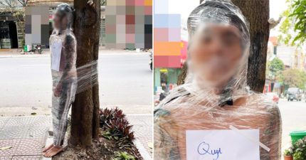 街頭驚見一男「膠帶綑樹上」 胸前字條寫:我討厭付刺青錢